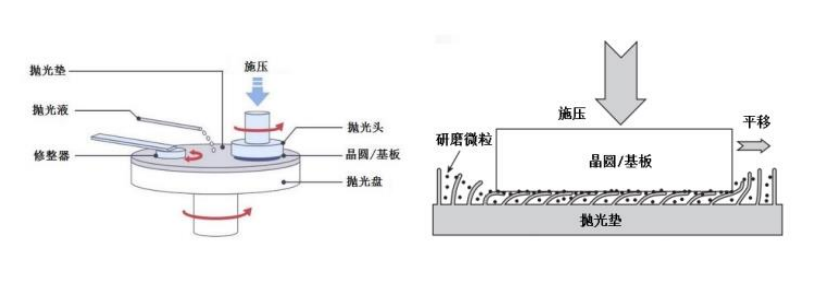 CMP又稱化學機械拋光技術,是使用化學腐蝕及機械力對加工過程中的硅晶圓或其它襯底材料進行平坦化處理。其設備包括拋光、清洗、傳送三大模塊,其作業過程中,拋光頭將晶圓待拋光面壓抵在粗糙的拋光墊上,借助拋光液腐蝕、微粒摩擦、拋光墊摩擦等耦合實現全局平坦化。目前的集成電路元件普遍采用多層立體布線,因此集成電路制造的前道工藝環節要進行多次循環。在此過程中,CMP技術是集成電路(芯片)制造過程中實現晶圓表面平坦化的關鍵工藝,是集成電路制造中推進制程技術節點升級的重要環節。